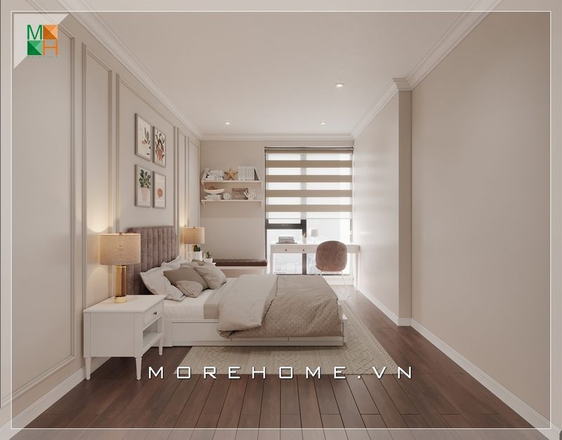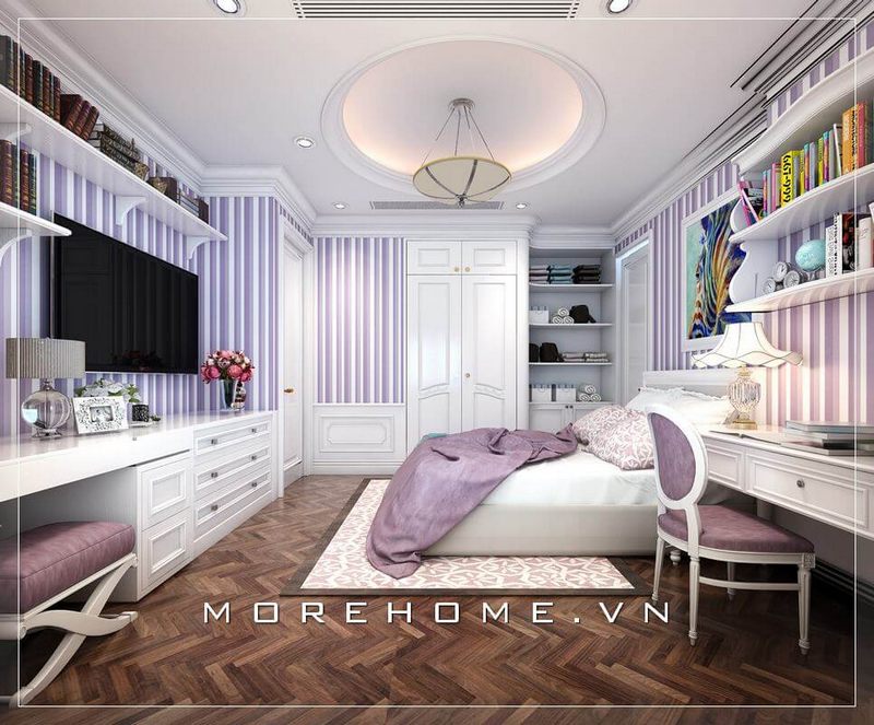 Ở không gian phòng ngủ chung cư cao cấp , gia chủ lựa chọn tone màu trắng chủ đạo, kết hợp với màu tím mộng mơ cùng sàn gỗ nâu trầm tạo nên sự sang chảnh mà không kém phần tiện nghi, độc đáo