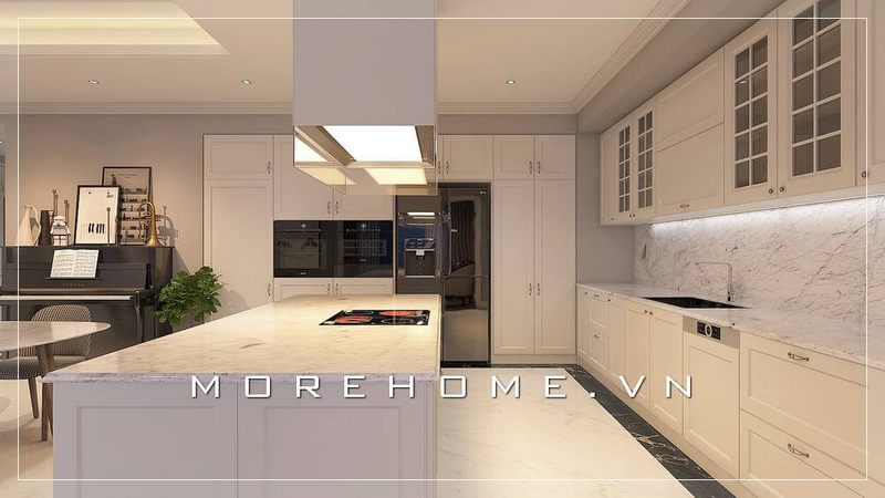 Thiết kế nội thất phòng bếp nhỏ theo phong cách tân cổ điển sang trọng và tiện nghi
