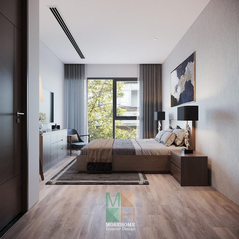 Sàn gỗ màu nâu trầm giúp phòng ngủ trở nên sang trọng và đẳng cấp hơn khi kết hợp với đồ nội thất hiện đại và tiện nghi.