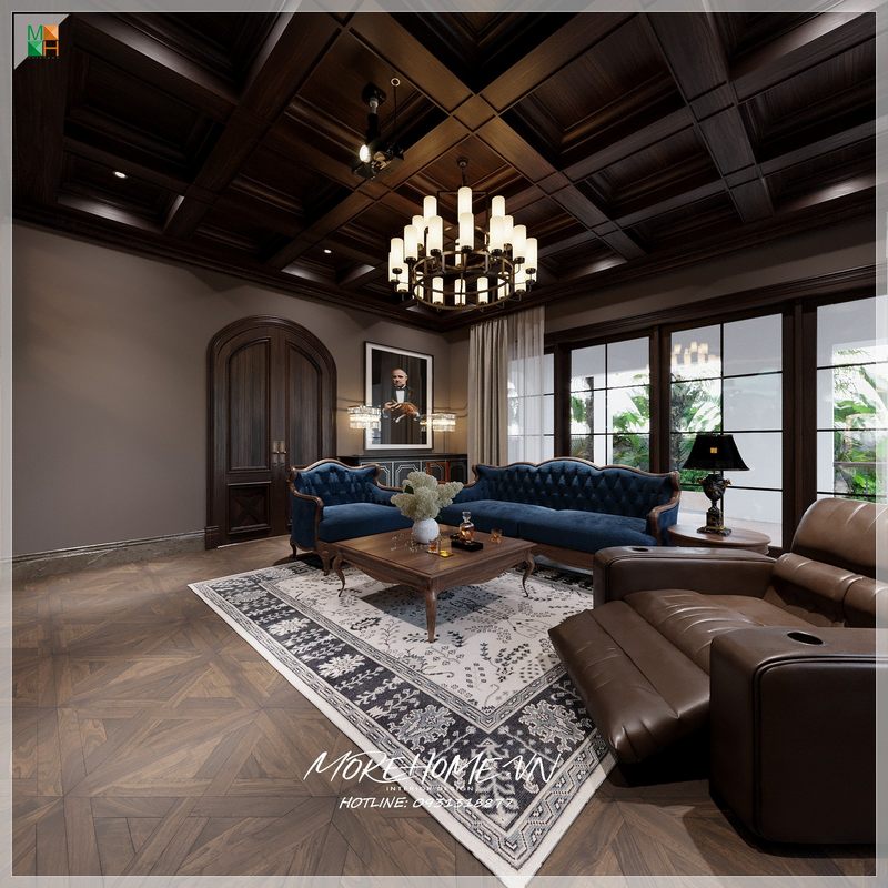 Sofa phòng khách có thiết kế cổ điển đẹp cao cấp, bọc bằng nỉ gỗ óc chó tân.