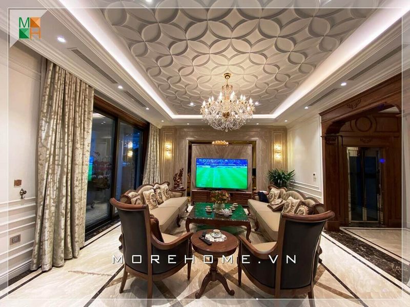 Bộ bàn ghế sofa khung gỗ tự nhiên đẹp, sang trọng là điểm nổi bật nhất của căn phòng khách. Những đường nét uốn lượn mềm mại đã giúp căn phòng trở nên ấm cúng, nhẹ nhàng và quý phái hơn.